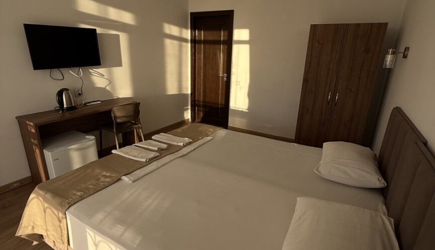 В номере есть мебель: вешалка, зеркало, двуспальная кровать, прикроватные тумбочки, стол, стул и шкаф. Также имеется необходимое оборудование: кондиционер, мини-холодильник и телевизор. Санузел оснащён душем, предоставляются туалетные принадлежности и фен.