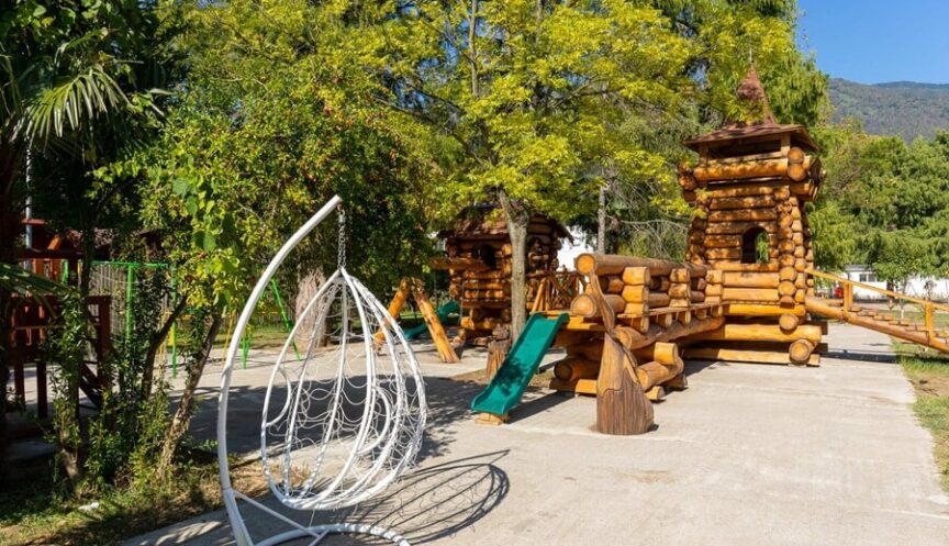 На территории отеля для юных гостей обустроена игровая зона. Здесь, под кронами деревьев, дети могут весело провести время. В тени парка они катаются на качелях или играют в уютном деревянном домике.